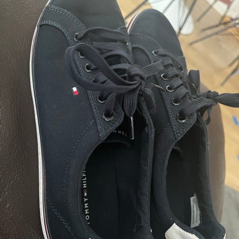 Tommy Hilfiger Sneakers i størrelse 37. Skoene er blå og har detaljer i brunt og hvidt. Designet er klassisk med snørebånd og et logoemblem på hælen, skoene har en casual stil velegnet til daglig brug.