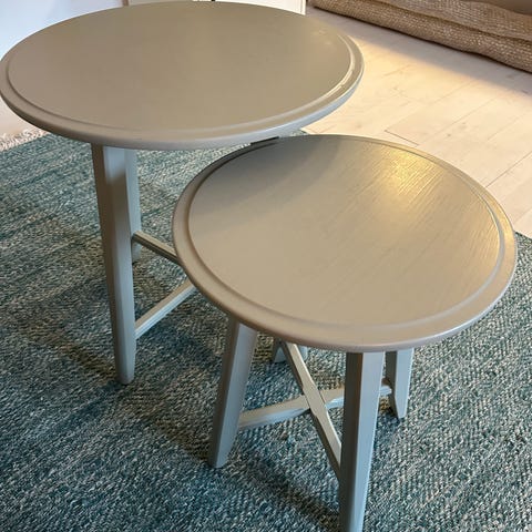 Sælger to små kvadratiske borde af solidt træ med glasplade - kan bruges samlet som sofaborde eller separat som sideborde.