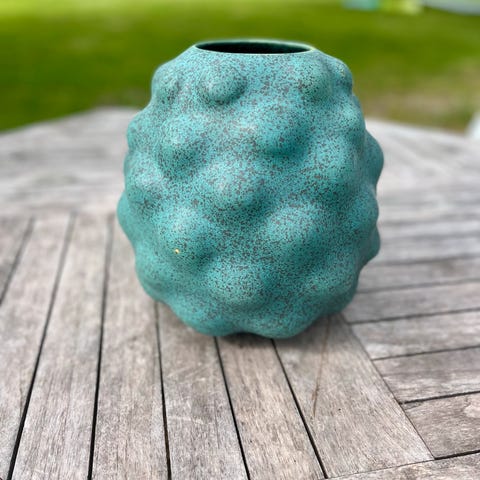 Ukendt mærke keramikvase med dekorative motiver af fugle og blomster i flere farver. Vasen har en rund form med en smal hals og en bredere bund. Velegnet til dekorativ brug i hjemmet.