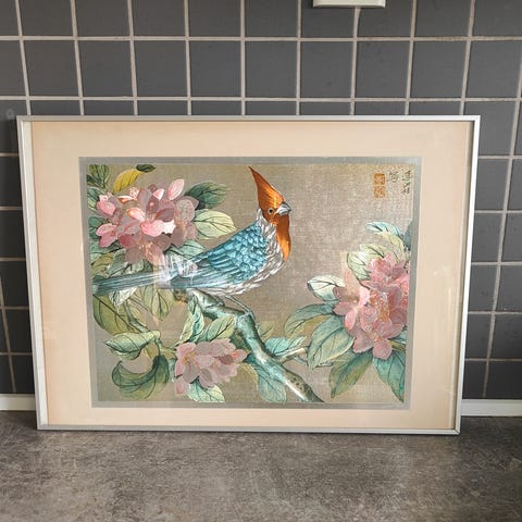 Asiatisk Silke tryk af fisk familie med 3 både. Billedet er signeret og meget dekorativ måler 25x35 cm
