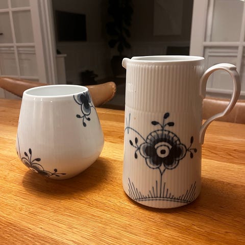 Royal Copenhagen Musselmalet riflet kande i porcelæn med klassisk blå og hvid dekor. Kanden har et håndmalet blomstermønster og er velegnet til drikkevarer.