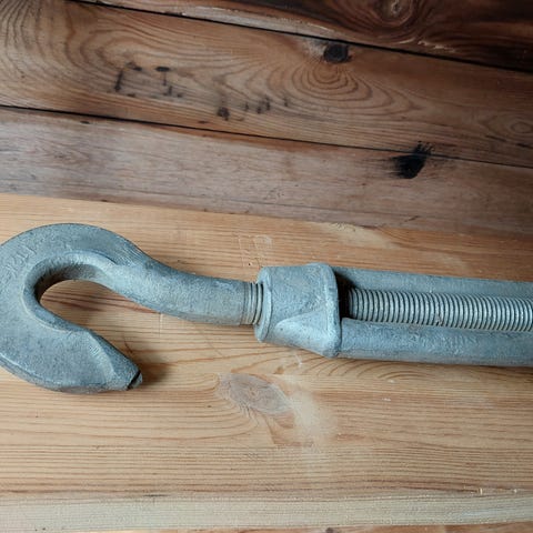 Kraftig galvaniseret vantskrue (også kendt som spændskrue / vendel) med øje i den ene ende og krog i den anden.