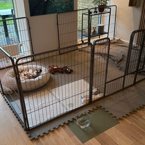 Komplet sæt til den drægtige tævehund. Fødekasse 150x150cm. Stor hvalpegård ca. 3x5m. (16 fag a 80x80cm. heraf 2 med låge)