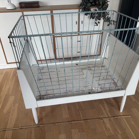Original Hevali udtræksseng i teak. Har også originalt hvidt “gitter” til babysengen.