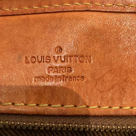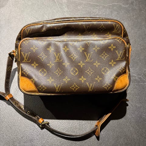 Louis Vuitton Vintage , skuldertaske i læder med ternet mønster og rød inderside. Tasken er designet til unisex brug og har justerbar skulderrem. Den indeholder flere rum til opbevaring og lukkes med lynlås og klap med trykknapper. Velholdt