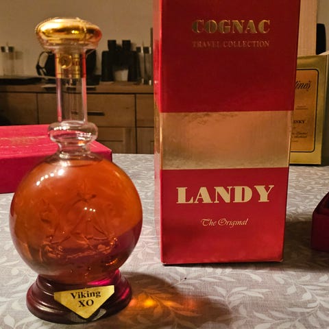 Andre samleobjekter, Vintage Cognac vugge, Rigtig gammelt Cognac skænke stativ / vugge i mahogny, med en flot, dekorativ gammel 4 liters / 1 gallon Remy Martin Cognac flaske fra 1940 erne. Flasken er solgt af Erik Andersen i Kjøbenhavn, og alle etiketter på flasken er i fin stand, hvilket også kan ses på billederne. I glasset på flasken er der skrevet (Federal law forbids sale or re-use of this bottle) Der sidder en fin og dekorativ Remy Martin Cognac skænkeprop på flasken, flasken er 37 cm høj. Perfekt til hjemme baren eller til Cognac nyderens samling