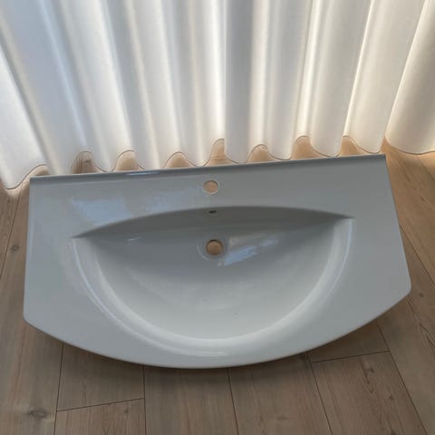 GRATIS Hvid porcelænshåndvask til skab . Fra røgfrit hjem. Ingen skår. Længde: 94,50. Bredde i siden: 37 cm. Bredde midt for: 51,00 cm. Befinder sig i Odense NV.