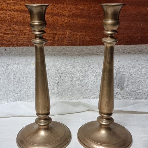 Et par messing lysestager sælges samlet. Højde cirka 18cm Fremstår med brugsspor.