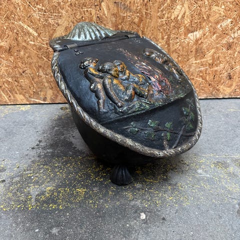 med motiv af birkeskov på lågen. Sælges for højeste bud. Jeg forventer at få mindst kr. 100 for den gamle genstand.