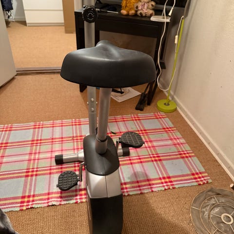 Motionscykel med justerbart sæde for tilpasning til brugerens højde. Velegnet til indendørs træning og konditionstræning. Brugt til genoptræning efter skade. Kan afhentes gratis.