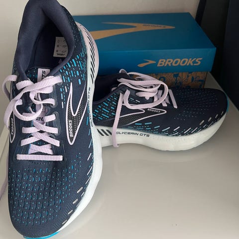 Sælger her et par HELT NYE Brooks Glycerin 20 løbesko til herre i størrelse 45. Skoen er designet til løb og har en farvekombination af sort med rød og hvid sål. Modellen er kendt for komfort og støtte under løb.