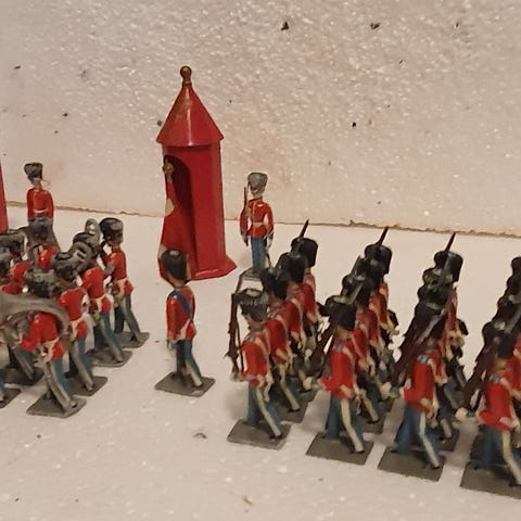 Tinsoldater med antik træborg, Træ og bemalet tin, 120 år gl.
