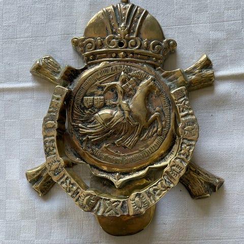 Dørhammer i messing med klassisk design. Velegnet til montering på døre som en dekorativ og funktionel dørklokke.