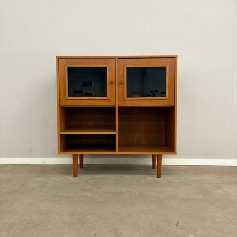 Skab med hylder indeni i Massivt teaktræ. Designet og lavet på Langeskov møbelfabrik 1989.