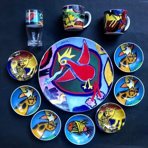 Smukke og spændende kopper med underkopper fra serien L` ete Commencant. Design af kunstneren Corneille. Kopperne fremstår i rigtig flot stand. Ø på kopper ca. 8 cm. Sælges pr. sæt at to dele (kop med underkop) til 95kr