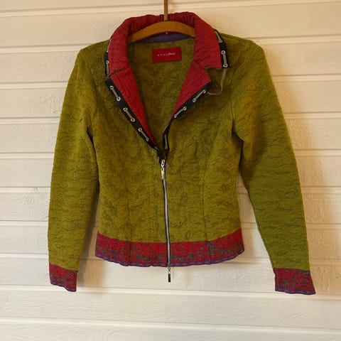 Smarte og feminine detaljer som fx. chancerende farver i materialet ved lynlåsen og søde “krøs”-kanter på både ærmer, liv og krave.