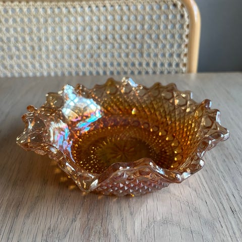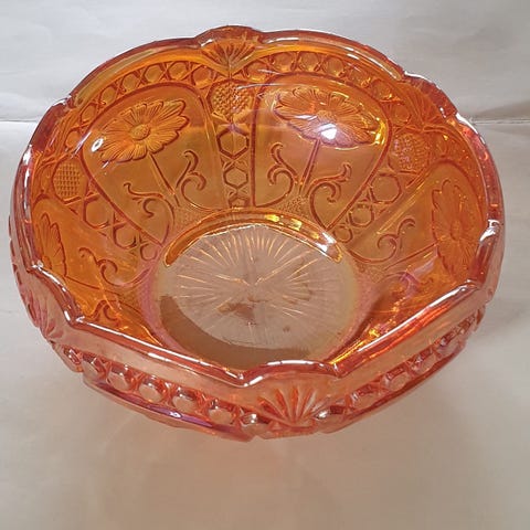 Meget flot orangerød skål i presset glas med lustre virkning, kaldet Carnival glas, største bredde 24 og højde 9,5 cm. Motivet er ophøjet på skålens yderside og viser vinranker med i alt 6 drueklaser rundt på siden af skålen. Skålen er i perfekt stand uden fejl eller mangler. Sender gerne, men køber betaler porto. Mobile Pay kan anvendes.