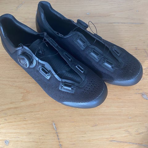 FLR cykelsko i størrelse 47 med hvid overdel og sort sål. Skoene har tre velcrolukninger og Look Keo kompatible klamper.