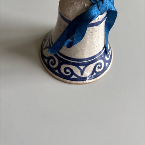 Eva Solo dekorationsklokke med indhold. Bunden er af gummistrimler, som der kan anbringes forskellige genstande i. Klokken er tapet på bunden, det er blot som sikkerhed, tapen tages bare af, når klokken når frem.