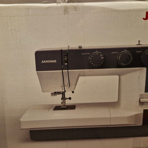 Janome Alevis symaskine med forskellige syfunktioner og digitalt display. Maskinen er designet til alsidig brug med flere indstillinger til syning af forskellige materialer.