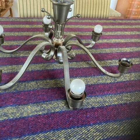 Loftlampe med tre arme med elfenbensfarvede glasskærme. Lampen har kæde til ophæng udført i metal (antik messing look). Skærmene har hver en diameter på 15 cm. Højde uden kæde 35 cm. Armene kan drejes så lyset går nedad.