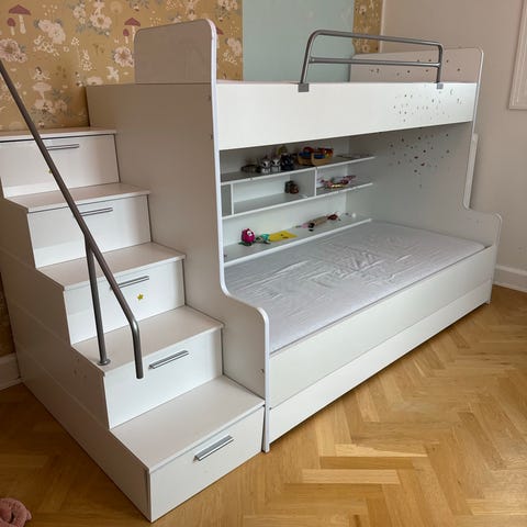 Gennemtænkt og pladsbesparende køjeseng i flot, moderne design. Sengen er en komplet all-in-one løsning med indbyggede hylder mellem køjerne, trappe med opbevaringsskuffer samt stort opbevaringsrum under sengen.