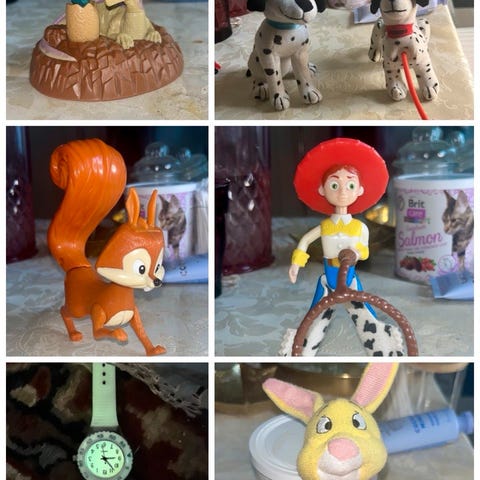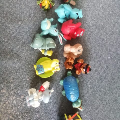 Flere figurer er mærket med producent og årstal (fx Fisher-Price, McDonald’s, Giochi Preziosi, Bullyland m.fl.). Standen er generelt brugt, men pæn – med almindelige brugsspor. Sælges kun samlet, ikke enkeltvis.