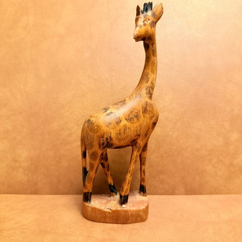Dekorativ håndskåret træskulptur af en giraf, udført i massivt træ og monteret på rund træfod. Figuren er skåret i ét stykke træ med naturlige former og synlig åretegning, hvilket giver et rustikt og autentisk udtryk.
