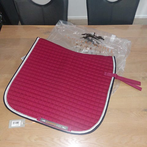 Flot dressurunderlag i gråt med lyserød pipe.