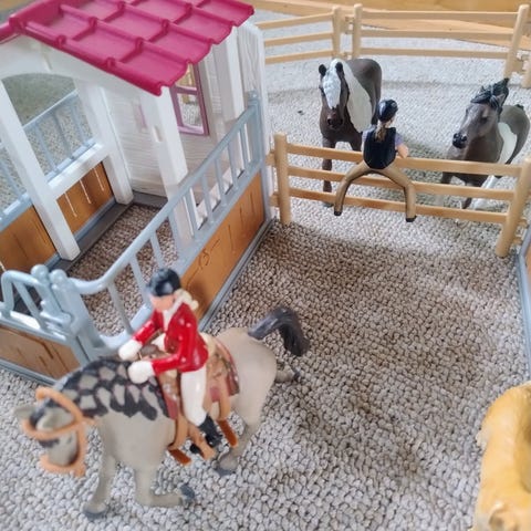 Schleich hestesæt indeholdende: flere hestefigurer ( i alt 9), ryttere/personer, bil med trailer, springbane og andet tilbehør.