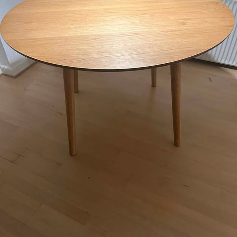 Vi sælger vores runde Hugo spisebord i egetræsfiner, som har et virkelig pænt og tidsløst design (fra Nimara). Det passer både perfekt ind i en moderne, men også vintage indretning. Det har fungeret rigtig godt hos os, fordi det ikke fylder for meget, men stadig giver en hyggelig spiseplads. Vi har haft det i 2 år, men vi har ikke siddet meget ved det - derfor vi nu sælger det videre.