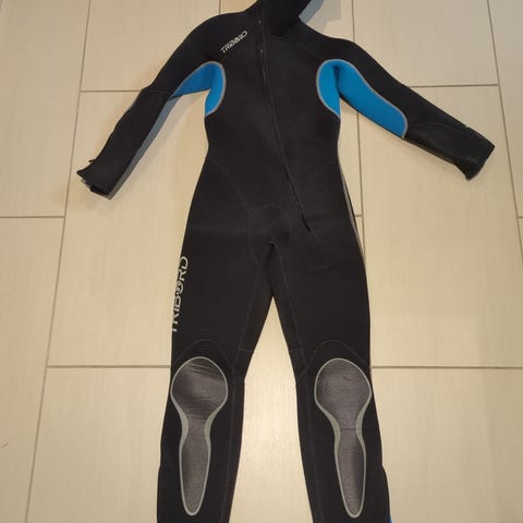 3MM våddragt i størrelse 9/10 år (134-140 cm) lavet af neopren. Farven er sort med grå detaljer. Designet til at give isolering og bevægelsesfrihed ved vandsport for børn.