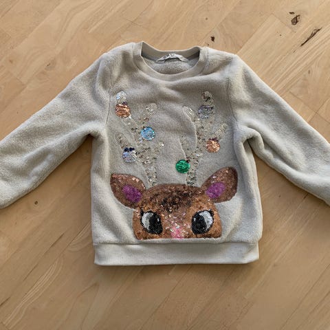 Fedeste julesweater til teenageren i flaskegrøn. Modellen er stumpet i længden og lidt poset i bredden, måler 47(L)x52(B). Super sød på, men i datter er skudt i vejret det sidste år, så hun kan ikke passe den i år.