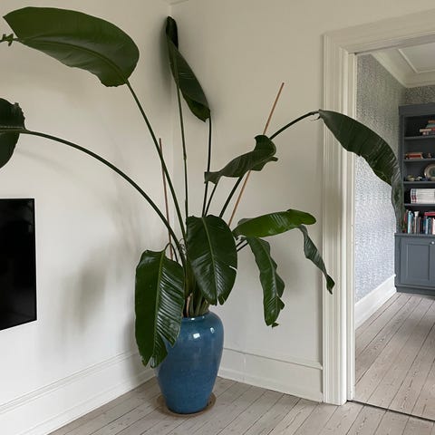 Ca. 2 meter høj inkl. krukke. Planten er ca. 4 år gammel og har haft rigtig god vækst. Den har oprindeligt kostet 350 kr og er sund og velholdt.