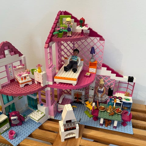 LEGO byggesæt med forskellige dele til at bygge huse og tilbehør. Indeholder farverige klodser og figurer til kreativ leg.