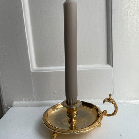 Smuk klassisk messing kammerstage med hank og justerbar lysestage. Et tidløst og dekorativt stykke boliginteriør, perfekt til hygge i vindueskarmen, på natbordet eller som en del af et vintage-inspireret stilleben.