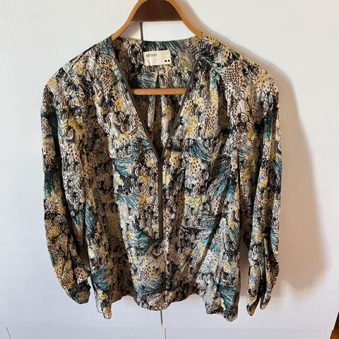 100% silke. En gul top fra RUTZOU med broderet (Ikke tryk) mønster i sort. Brugt få gange.