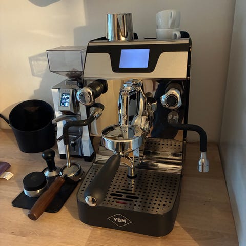 Med direkte vandtilslutning, den har altid kørt med DVA kalkfilter/ionbytter. Ellers er det også muligt fra en dunk (med blødt vand). Jeg har skiftet håndtag på damp/vandhaner fra de små trekantede til store VBM Replica håndtag. Bedre ergonomi, og flottere. De oprindelige håndtag og møtrikker medfølger.