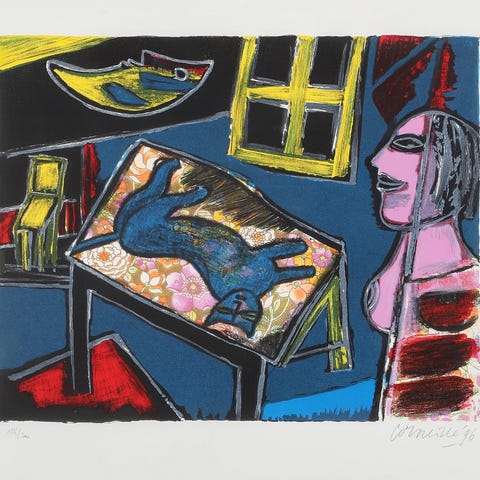 Corneille, motiv: komposition med kvinde (signeret), Corneille - medlem af Cobramalerne - litografisk tryk af galleriplakat fra 1985 - komposition med kvinde - udover tryksigneringen er det originalt signeret af Corneille m. blystift. Corneille 85, mål 71 x 51