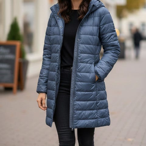 Ægte dun fyld, flot beige farve, let A-facon, lynlås, trykknapper, og dejlig høj og justerbar krave, med skjult, tynd hætte.