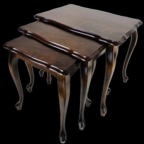 Dette sæt Napoleon III-stil nesteborde er en raffineret udstilling af det klassiske dekorative møbel, hvor funktionalitet kombineres med en sofistikeret og ornamenteret æstetik. Bestående af tre borde i faldende størrelse, der passer ind i hinanden, tillader dette design at optimere pladsen uden at gå på kompromis med det visuelle luksus.