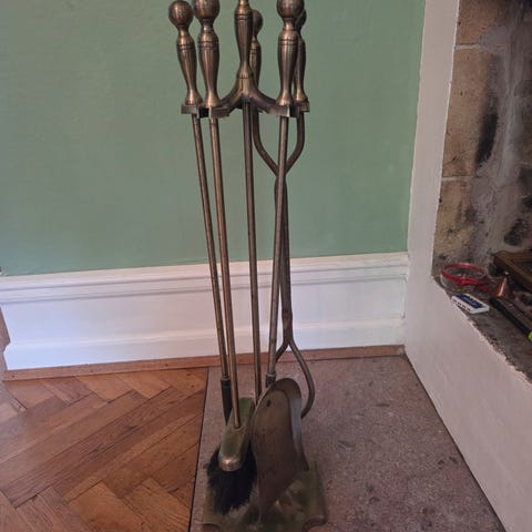 Messing ildsted fra Holland, dateret til 1950–1960, i god stand med mindre aldersrelaterede tegn; højde 69 cm, bredde 16 cm, dybde 16 cm og vægt 3 kg. Klik på den blå "gå til varen" knap, for at købe eller byde på denne vare. Den samlede pris vil blive vist inden du afgiver dit bud.