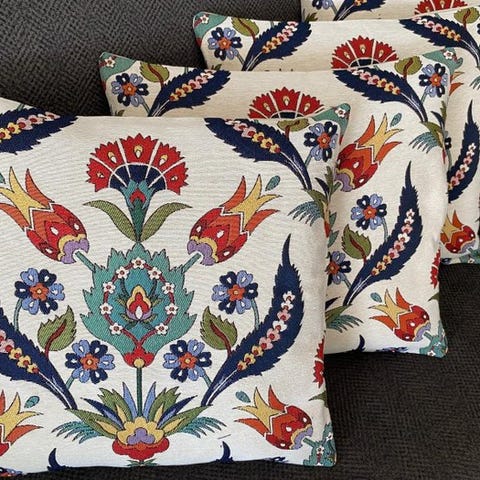 Fire vævede tapetkæmpebetræk (43 cm x 43 cm), fremstillet i Tyrkiet af linned, bomuld og silke, med skjult lynlås og traditionelle motiver, i nyskick og sendt tomme. Klik på den blå "gå til varen" knap, for at købe eller byde på denne vare. Den samlede pris vil blive vist inden du afgiver dit bud.
