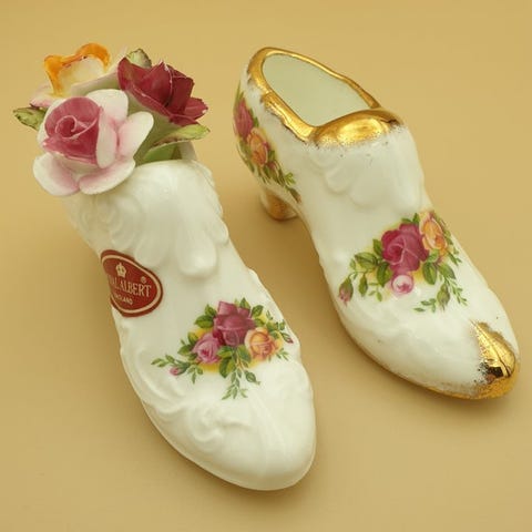 Royal Albert Old Country Roses posy slippers i benporcelæn med gyldne detaljer, i fremragende stand, Storbritannien, 1960–1970, to stk., højde 11 cm, bredde 4 cm, dybde 6 cm, vægt 253 g. Klik på den blå "gå til varen" knap, for at købe eller byde på denne vare. Den samlede pris vil blive vist inden du afgiver dit bud.
