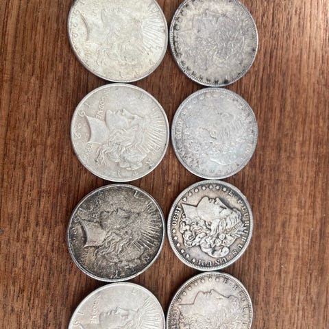 Sælger 6 originale amerikanske sølvdollars 3 Morgan Dollars og 3 Peace Dollars.
