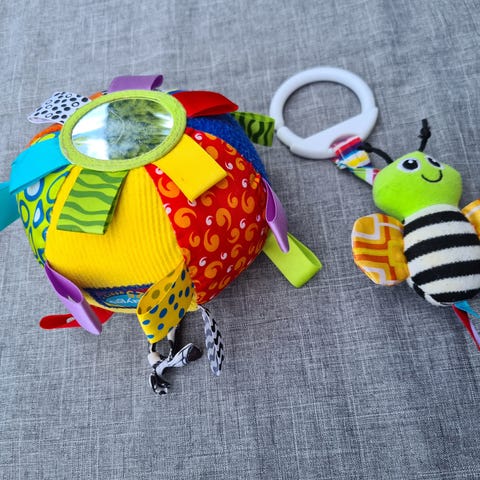 Sættet indeholder forskellige typer babylegetøj i flere farver og former, herunder bløde bolde, rangler, en plastiktelefon og figurer som giraf og fisk. Materialerne varierer mellem stof og plastik, designet til spædbørn og småbørn.