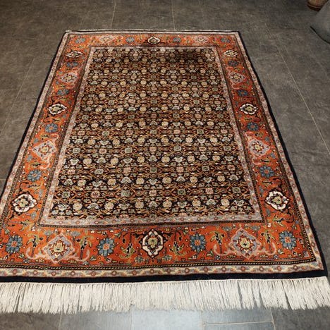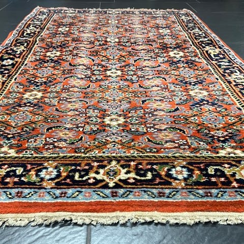 Oprindelse: Indien; håndknyttet orientalsk tæppe i uld på bomuld, mål 195 cm × 118 cm, 1 stk, fremstillet i slutningen af 1900-tallet, generelt god stand, med ægthedscertifikat. Klik på den blå "gå til varen" knap, for at købe eller byde på denne vare. Den samlede pris vil blive vist inden du afgiver dit bud.