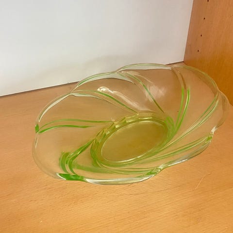 De små mængder uran i glasset får denne figur til at gløde strålende grønt i UV-lys.