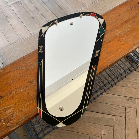 Makeup-spejl, perfekt til brug på et lille møbel som et natbord eller en hallskab. Typisk dekoration fra perioden, med tre lyserøde glasroser på siderne og bunden. Rammen er helt i glas med krystal-lignende refleksioner. En træpanel og en stand er monteret på bagsiden.