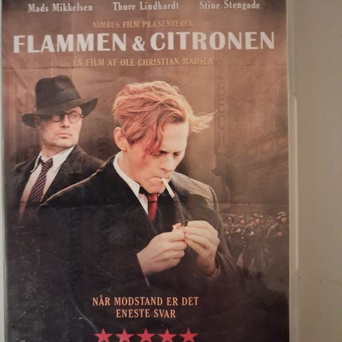 Flammen & Citronen, instruktør Ole Christian Madsen, DVD, drama, 1944. Vi befinder os i det besatte København. Mens resten af landet håber, at krigen snart får ende, er modstandsfolkene 'Flammen' (Thure Lindhardt) og 'Citronen' (Mads Mikkelsen) Holger Danske gruppens mest effektive våben, skarpt holdt til ilden af politichef Winther (Peter Mygind). Da Flammen beordres til at henrette sin kæreste, Ketty (Stine Stengade), kommer han imidlertid i tvivl. I kampen for landets frihed er zonerne grå, og det bliver sværere og sværere at finde grænsen mellem venner og fjender...